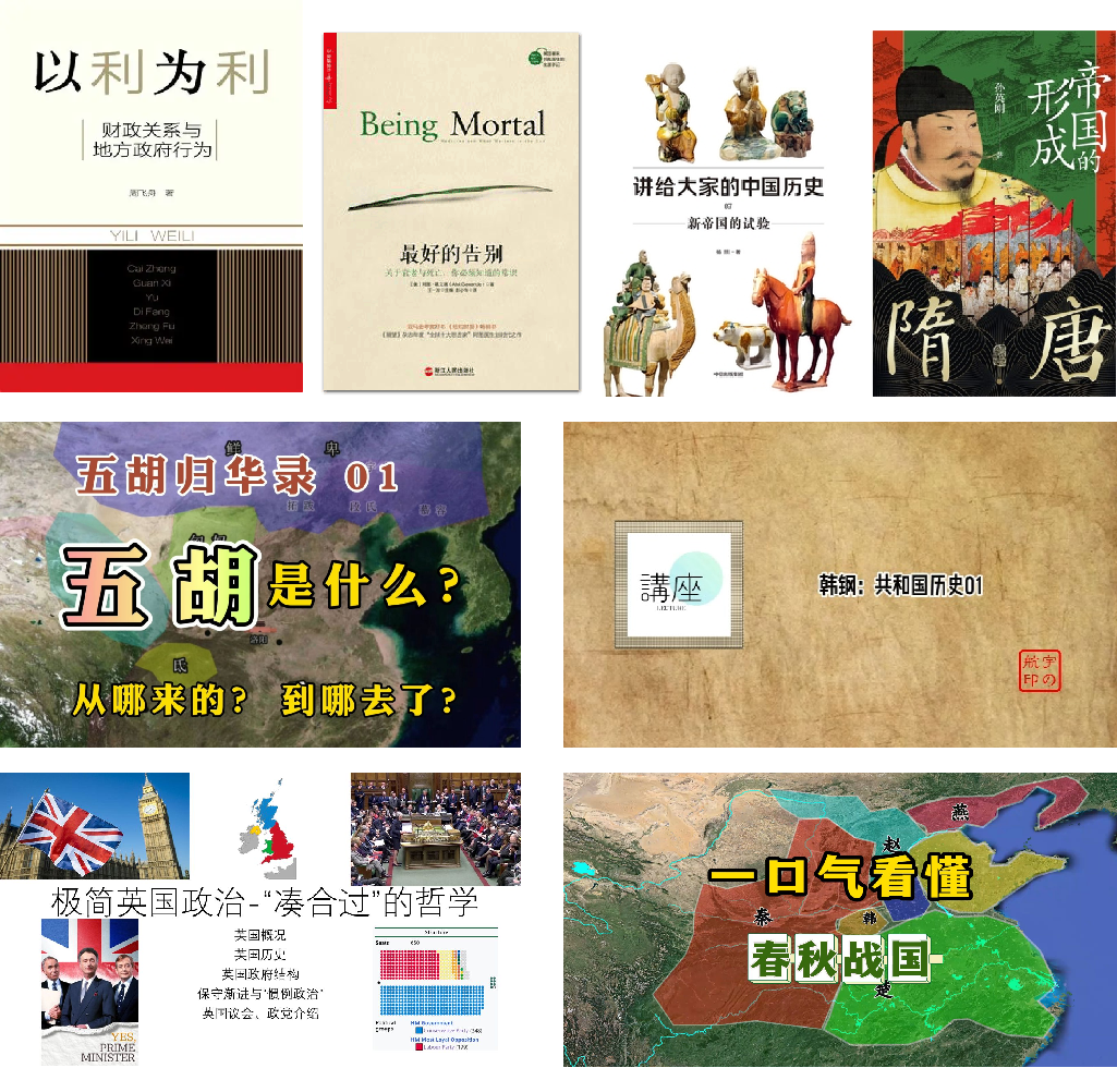 - B 站视频:mhyyyy《鉴证人物志、政治坐标系、极简国家政治、意识形态详解》、韩钢《共和国历史》系列、王山水读图鉴《春秋战国历史、两晋南北朝历史》。
